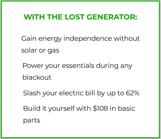 6º If you’ve been searching for a practical, affordable, and proven solution to reduce your energy costs and gain independence, The Lost Generator is the best investment you can make right now. Don’t wait until the next blackout or another painful electricity bill. Click below and see for yourself how easy it is to transform your home’s energy reality today.